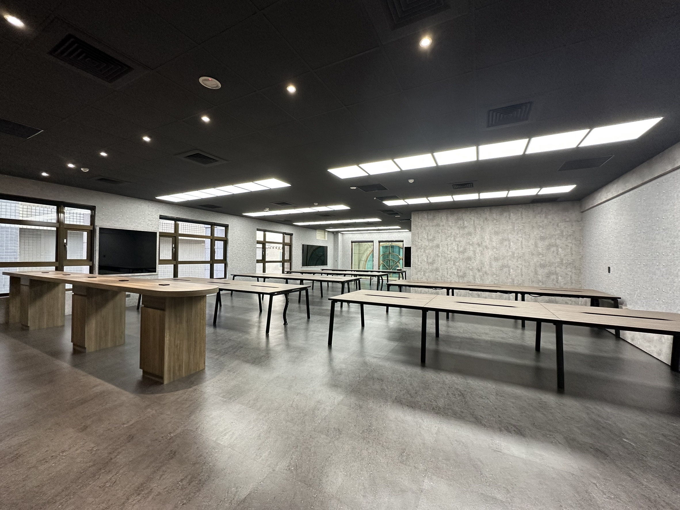 工業灰調智慧入口辦公室入口處設置小型智慧面板,作為空間控制的核心裝置,可操作燈光調光與場景模式,讓整體照明能依不同使用情境靈活調整。簡潔的配置使進門動線俐落明確,同時也展現空間結合智慧設備的實用特性,為辦公環境建立便利且直覺的使用體驗。交流空間放鬆片刻規劃開放式點心吧檯區,結合收納櫃體與冰箱機能,提供日常補給與公共用品的收納空間。桌面設置多組電源插座,可供裝置充電使用,使此區不僅是休憩角落,也能作為臨時工作的交流場域。木質桌面搭配溫潤色調,為整體空間帶來自然且放鬆的氛圍。專注討論場域辦公區大型工作桌排列,寬敞且具彈性的工作環境。桌面與吧檯皆選用柔和的木質色調,搭配灰色工業風牆面貼皮,展現沉穩而現代的辦公氛圍。牆面局部設置黑板區,可供即時討論與書寫紀錄,增加團隊交流的便利性。後方另設會議室空間,以隔間區分但延續相同設計,讓整體辦公環境保持一致的風格與秩序。 ...