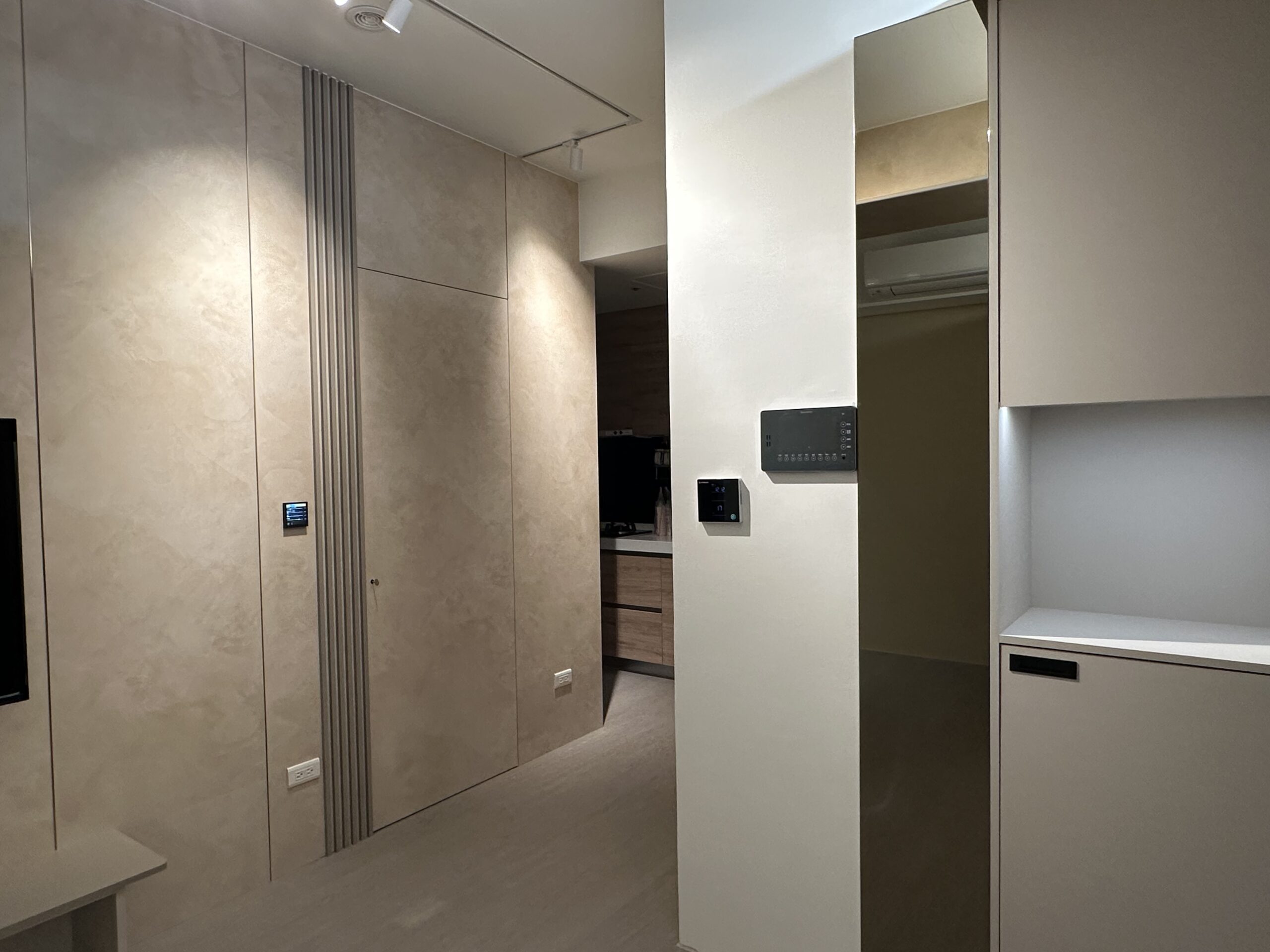 光影層次線條光感玄關玄關空間以燈條作為主要設計,透過不同幾何線條的燈光配置,形成立體且具有節奏感的氛圍。光線沿著牆面與櫃體延伸,使入門視覺更加俐落且富有層次。整體氛圍簡潔而具有現代感,在低調之中呈現細膩的空間表情。現代開放式入戶後銜接開放式廚房,櫃體以深色木質下櫃搭配淺奶茶色光滑面上櫃,形成深淺對比的溫潤層次,兼具現代感與生活溫度。客廳地面鋪設帶有淺褐灰調的木質地板,使空間整體更加柔和自然。電視主牆選用灰色大理石紋理材質,帶有白與黑的自然紋路,為空間增添沉穩而具有質感的視覺焦點。靜謐溫潤臥室地面延續木質,選用比客廳更深的褐色木地板,營造安定且溫暖的休憩氛圍。獨立的小型衣帽間以實用機能為主,黑色金屬吊衣桿搭配藍灰色櫃體,呈現俐落且帶有個性的收納空間,使整體私領域兼具實用與設計感。 ...